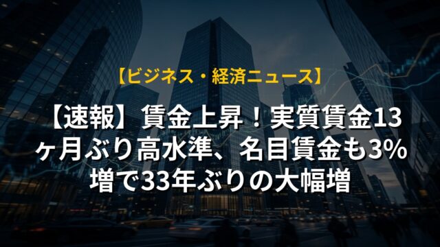 【速報】賃金上昇!実質賃金13ヶ月ぶり高水準、名目賃金も3%増で33年ぶりの大幅増