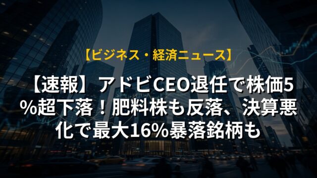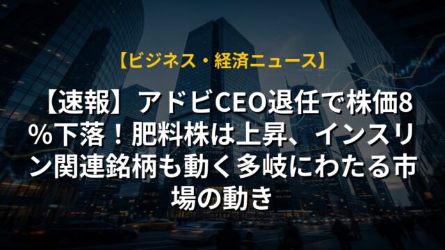 【速報】アドビCEO退任で株価8%下落!肥料株は上昇、インスリン関連銘柄も動く多岐にわたる市場の動き