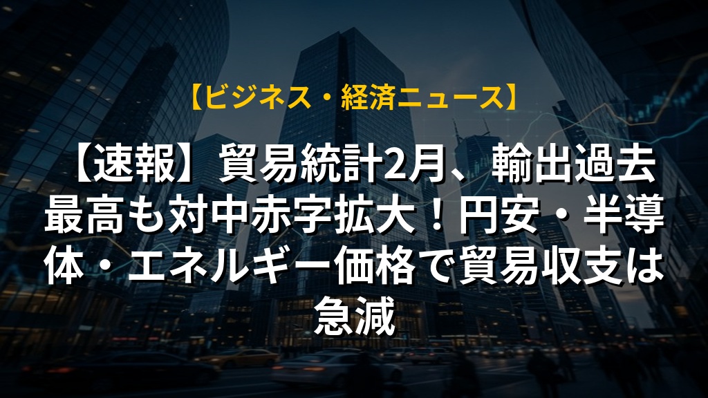 【速報】貿易統計2月、輸出過去最高も対中赤字拡大!円安・半導体・エネルギー価格で貿易収支は急減