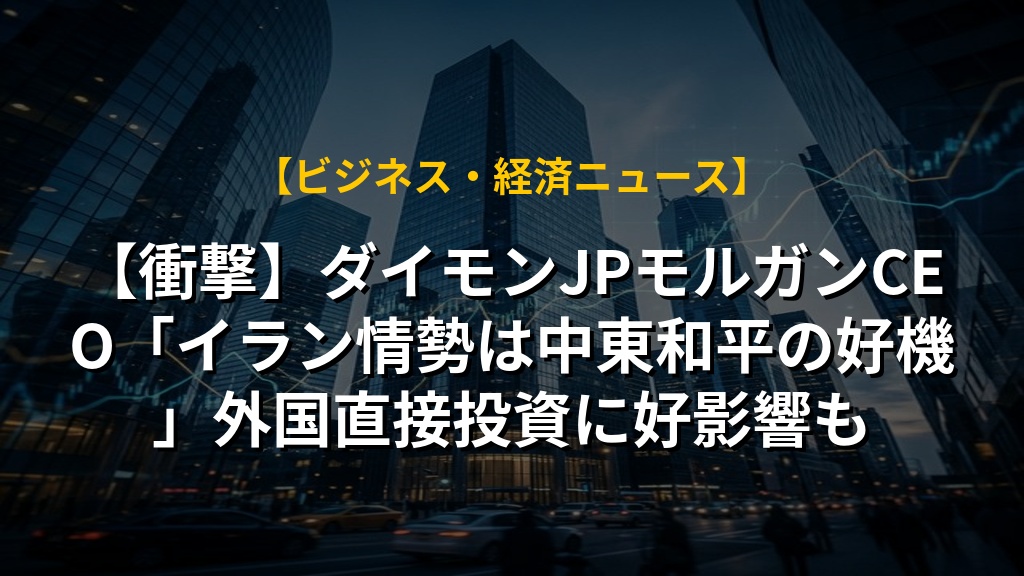 - J.P.モルガン・チェースCEOのジェイミー・ダイモン氏は、イランでの紛争は短期的リスクだが、中東の恒久平和に繋がる可能性を示唆。
