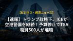 - トランプ政権下で国境警備を統括したトマス・ホーマン氏が、連邦議会の資金停止問題で、大統領がTSA職員への給与支払いを他の手段で賄うと表明。