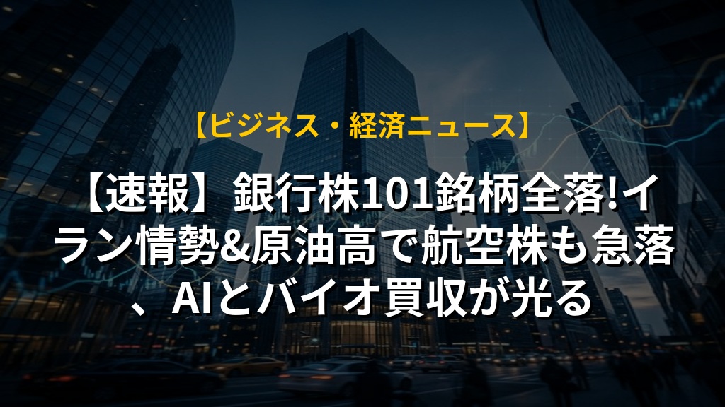 【速報】銀行株101銘柄全落!イラン情勢&原油高で航空株も急落、AIとバイオ買収が光る