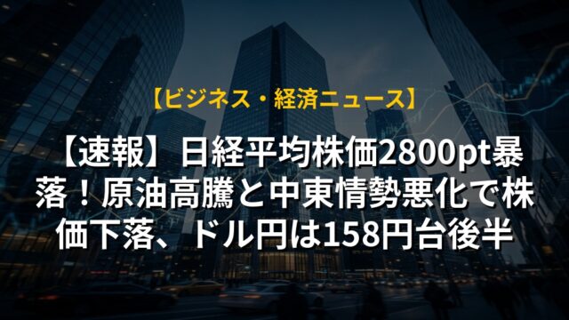 【速報】日経平均株価2800pt暴落!原油高騰と中東情勢悪化で株価下落、ドル円は158円台後半