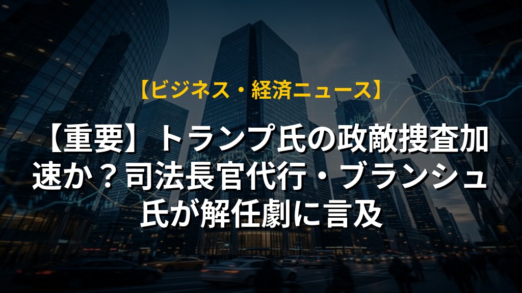 トランプ前大統領の司法長官代行にトッド・ブランシュ氏が就任し、大統領の要請があれば正式な就任も辞さない姿勢を示しています。司法省が政敵の迅速な起訴を求められていた背景もあり、捜査への政治的な影響が懸念されます。