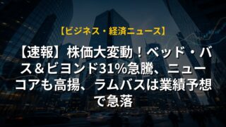 【速報】株価大変動!ベッド・バス&ビヨンド31%急騰、ニューコアも高揚、ラムバスは業績予想で急落取引後株価のニュース概要 取引終了後の注目企業についてまとめます。 ベッド・バス&ビヨンドは、第1四半期の売上高が2億4780万ドルと、...
