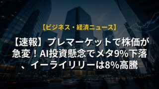 【速報】プレマーケットで株価が急変!AI投資懸念でメタ9%下落、イーライリリーは8%高騰プレマーケット株価のニュース概要 株式市場のプレマーケット取引で注目を集めている企業の動向が報告されています。 メタ・プラットフォーム...