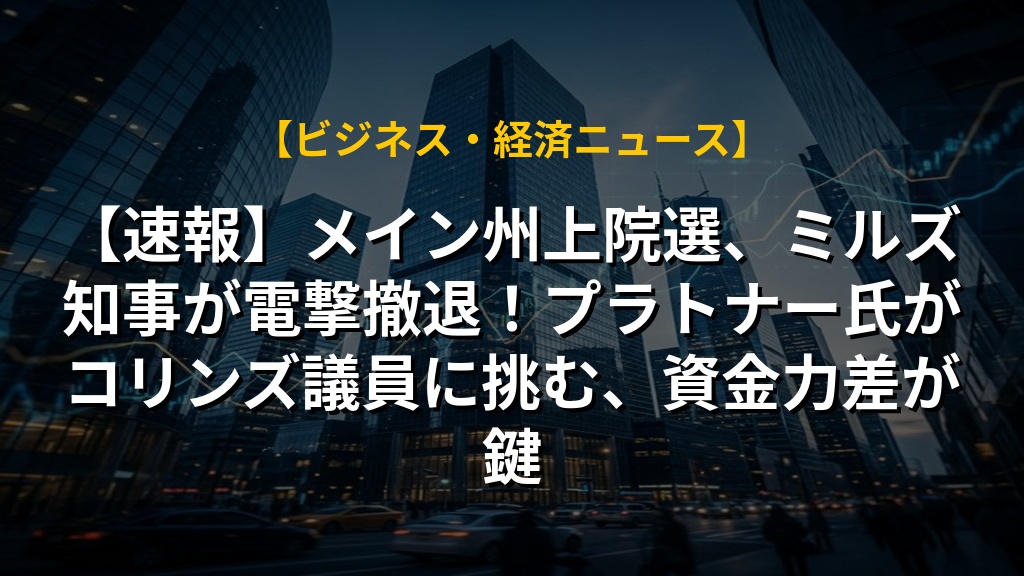 【速報】メイン州上院選、ミルズ知事が電撃撤退!プラトナー氏がコリンズ議員に挑む、資金力差が鍵