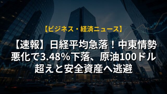 【速報】日経平均急落!中東情勢悪化で3.48%下落、原油100ドル超えと安全資産へ逃避