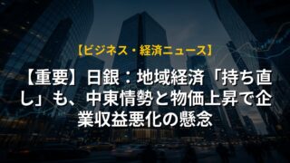 【重要】日銀:地域経済「持ち直し」も、中東情勢と物価上昇で企業収益悪化の懸念